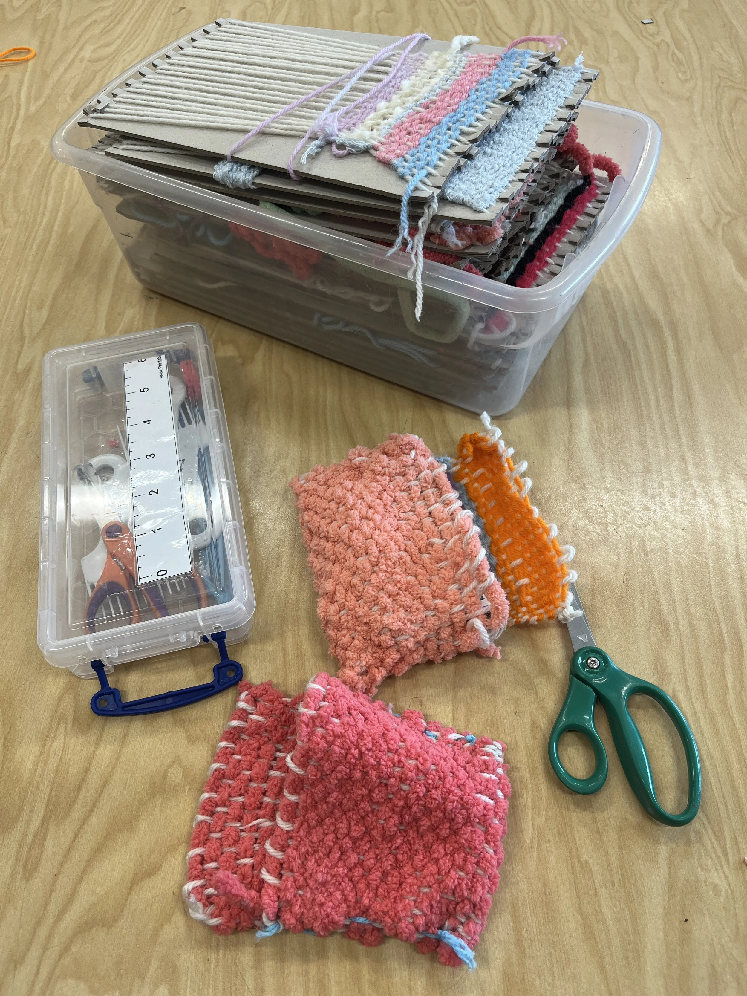 I keep cardboard looms for each of my five 4th grade classes in plastic bins. Here you can see the woven pouches of some early finishers. Every table gets a tool kit with 2 pairs of scissors, 4 combs, and 4 tapestry needles.