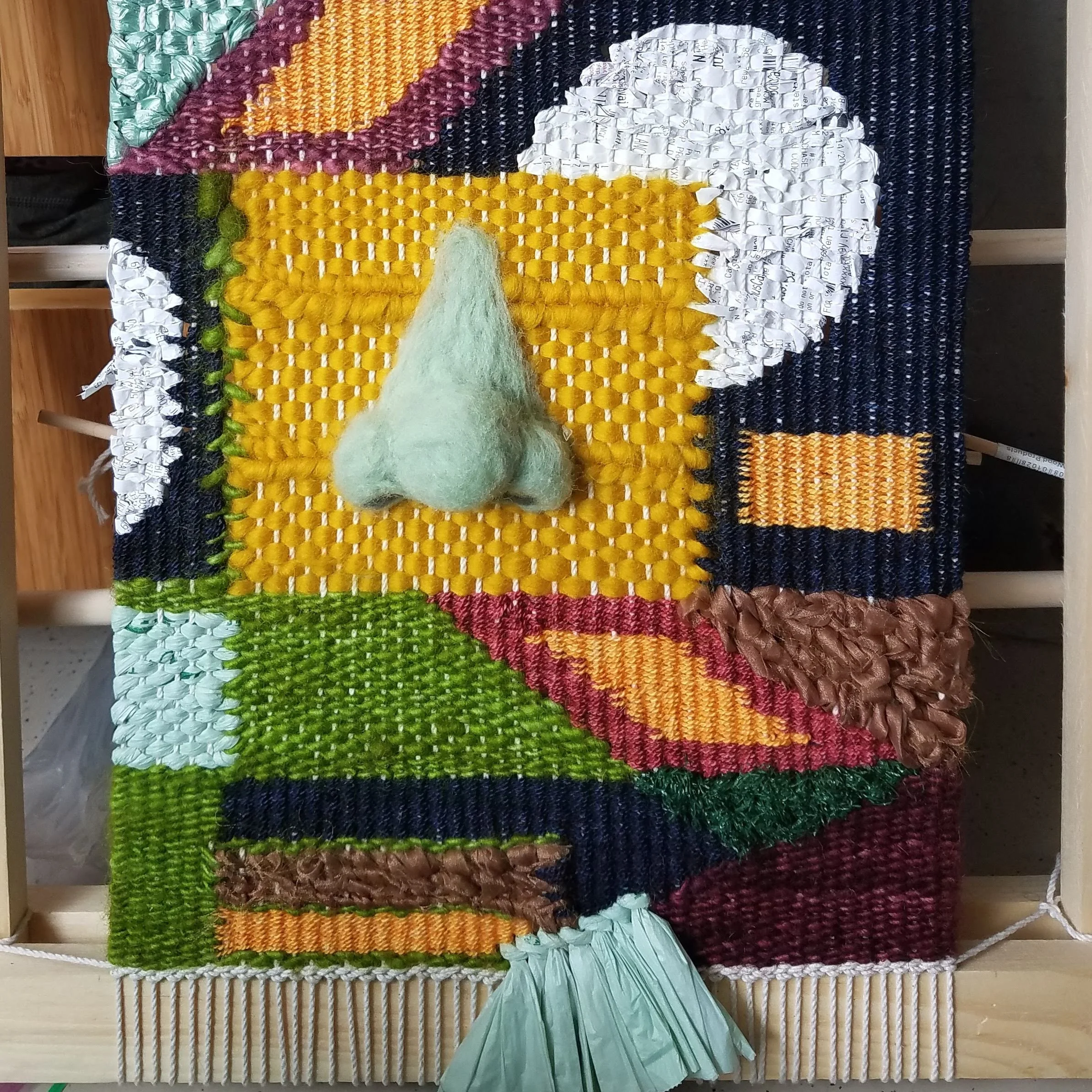 My very first tapestry weaving my freshman year in art school! I hand-dyed the yarn, wove in random materials from the grocery store, and needle felted a nose sniffing around for just right the produce.