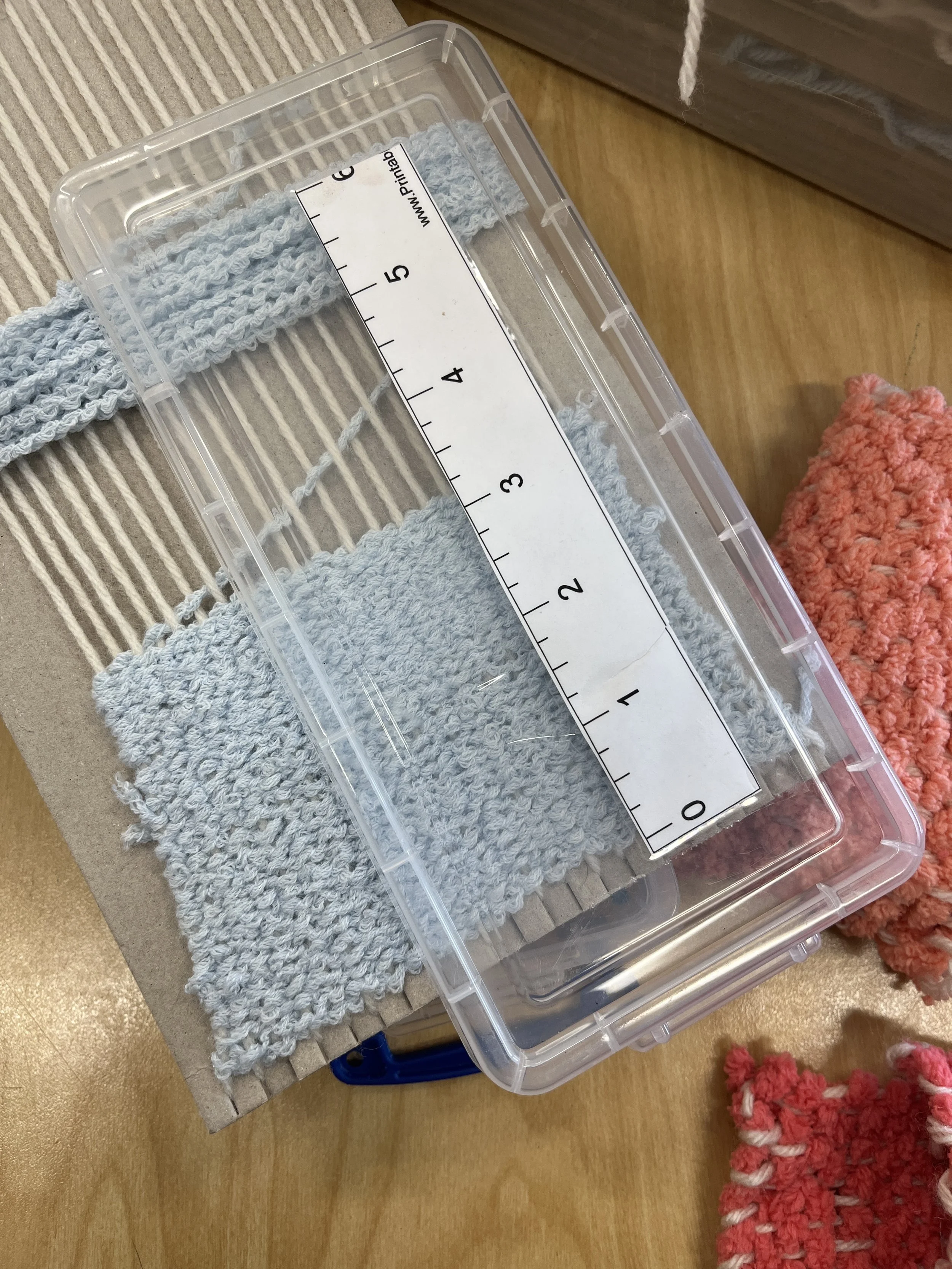 On the lid of my weaving tool kits, I tape a printed paper ruler. I ask students to measure their projects each week so they can track their progress. Students who are really motivated to make an entire pouch will often measure zealously.