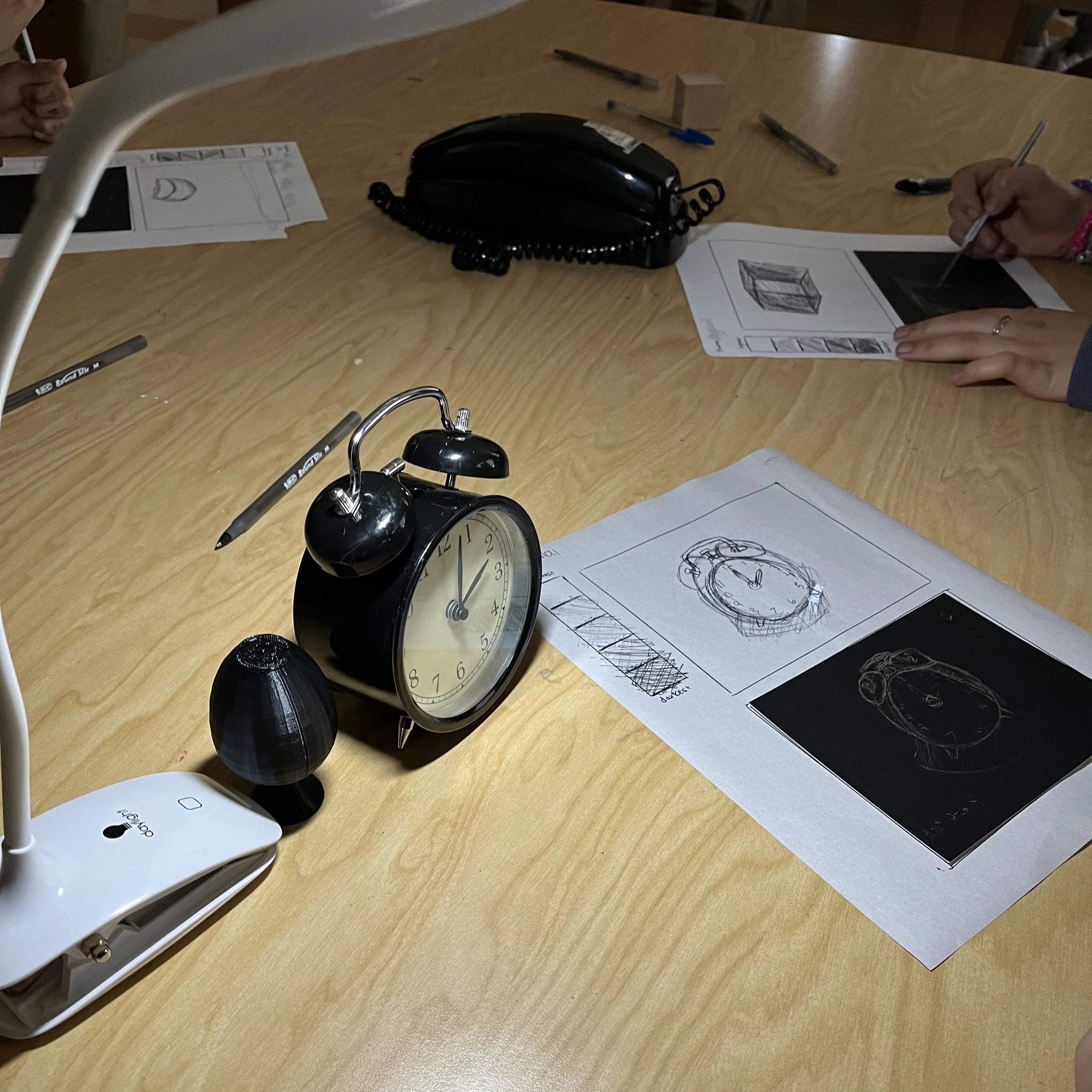 We set up our still lifes with clip lights attached to lunch trays. I inherited a great set of fake fruits from a retired art teacher, and they got tons of use in this unit. Another colleague loves 3D printing and made an entire set of cubes, spheres, pyramids, and cylinders. Lucky us!